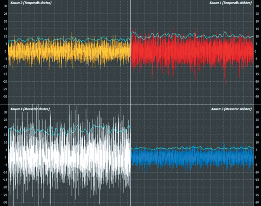 Рис. 1. Окно сигналов электромиограммы с асимметрией биоэлектрической активности жевательных и височных мышц.
